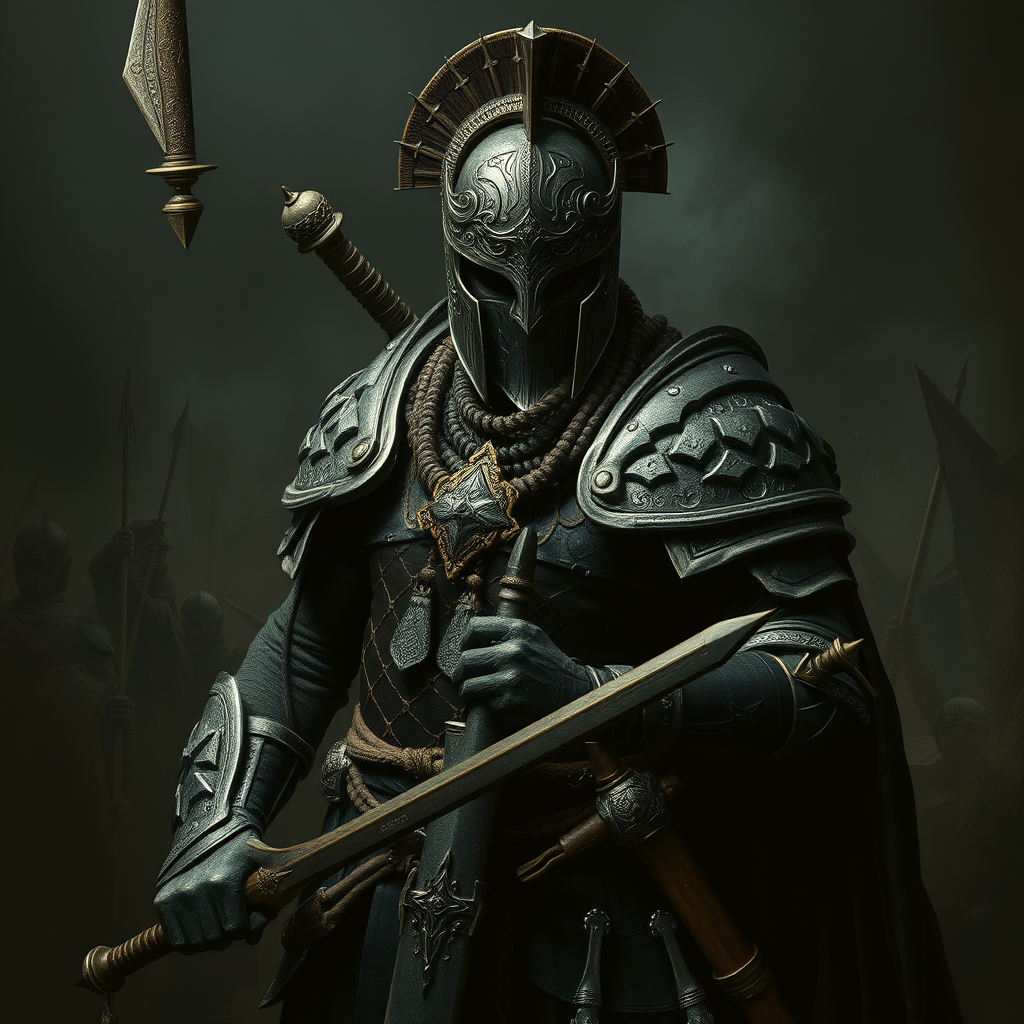 Intricate armor and weapon, set against a battlefield background, highlighting a dark tones palette. The figure strikes a militant pose in a portrait style, exuding subtle intensity and power rather than overt rage or anger. This composition embraces an emotional, epic feel with tribal dark fantasy elements, emphasized by dramatic shadows that add depth and mystery.