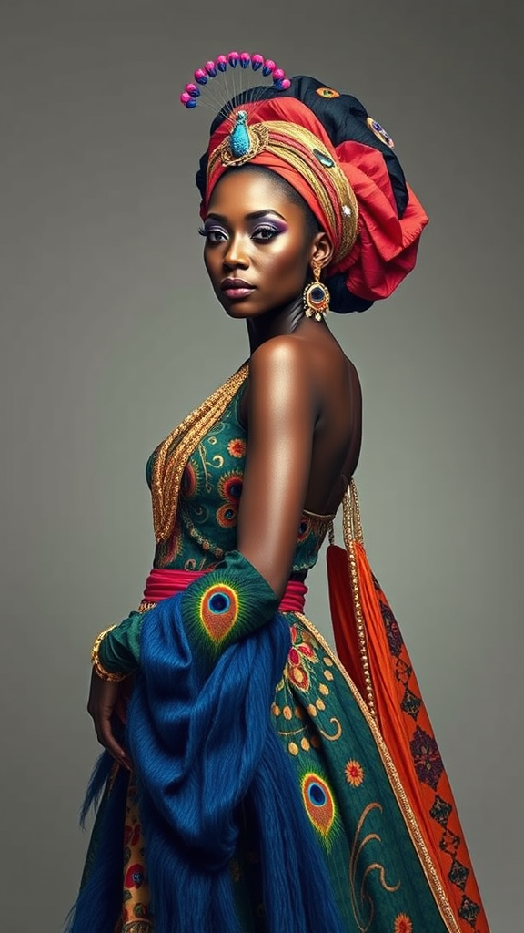 Intricate art deco Afro-Caribbean model posing in a vivid art deco-inspired peacock gown and sari, featuring elaborate patterns, with face art reflecting the era; studio portrait, ultra-high definition, Octane-rendered 8k CGI, with a whimsical touch reminiscent of Sylvain Chomet's style, infused with the vibrant and dynamic aesthetic of Team Fortress 2 and the adventurous spirit of Breath of the Wild, integrating bold color theory.