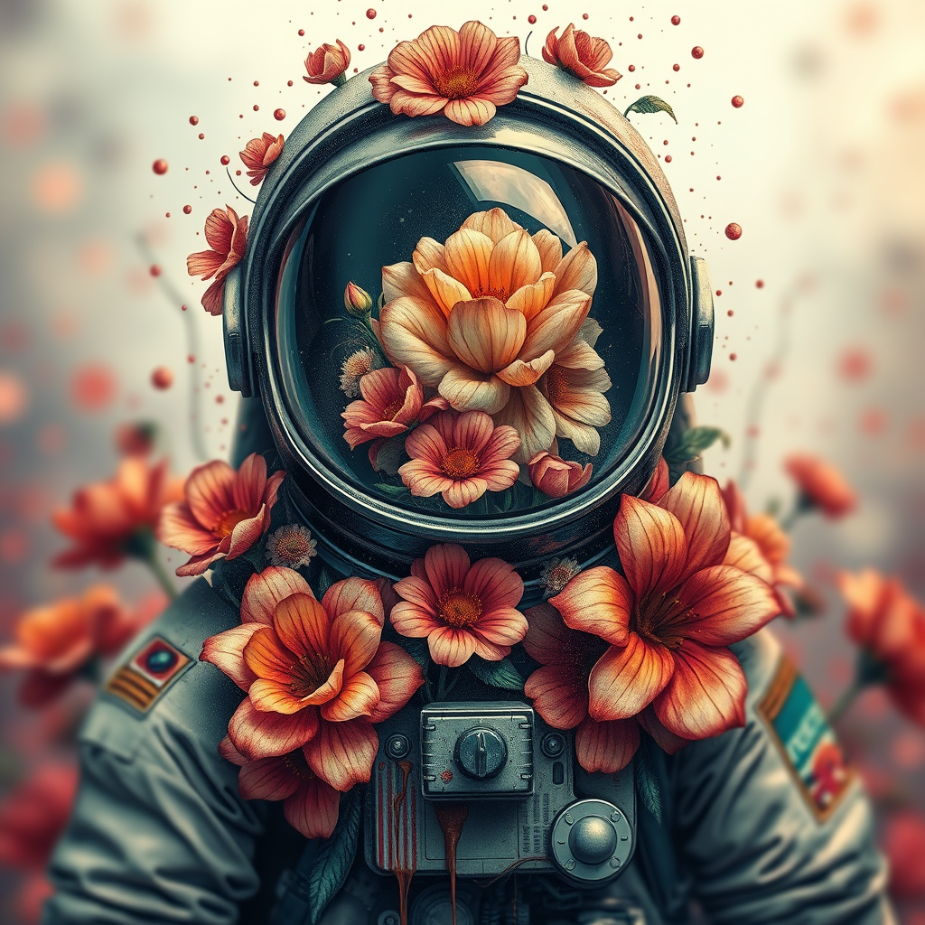 Intricate astronaut with a helmet bursting into vibrant flowers, accentuating the beauty within the cosmos; heavily influenced by precise anatomical drawings, featuring splashes of dripping paint blending seamlessly with coquelicot hues, amidst a soft, blurred depth of field, yet in an unconventional 16:9 ratio, offering high-quality visual richness.
