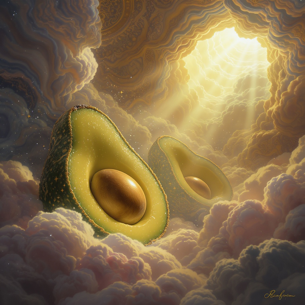 View this AI-generated image featuring intricate avocados basking in ethereal god rays fill the celestial waiting room to heaven a scene illuminated by cinematic lighting and adorned with exquisite details capturing a sense of genius amidst swirling beautifully painted 8k clouds. Created using advan
