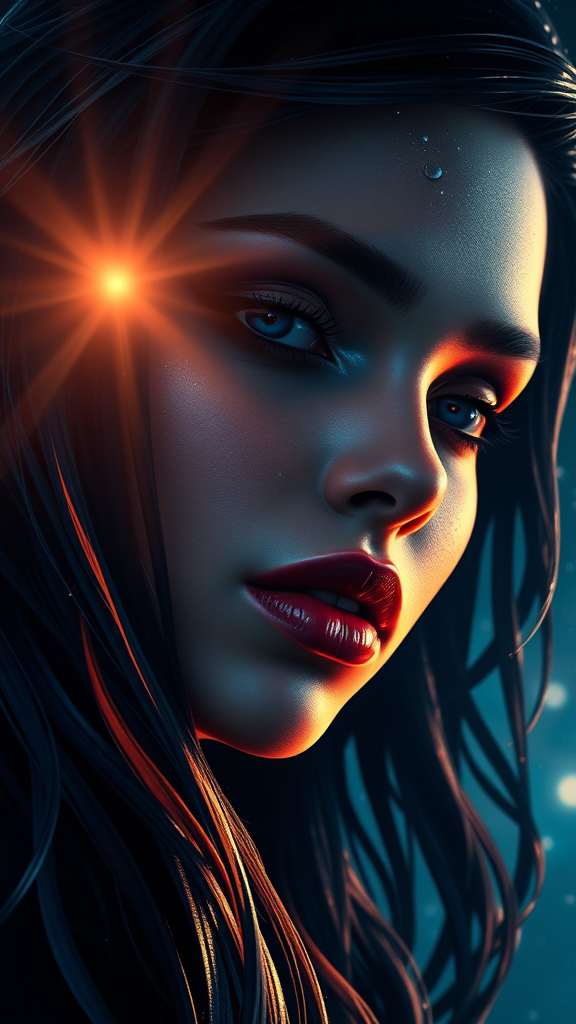 Intricate cinematic masterpiece in ultra high definition, capturing a midnight aura under a starlit sky with a detailed, alluring face framed by a dreamy, glowing backlight. The composition exudes glamour and glimmer, enhanced by the interplay of shadows reminiscent of oil on canvas with smooth brush strokes. Inspired by the artistic styles of Alberto Seveso, Artgerm, and Loish, this epic scene is a fusion of vibrant, ultra high quality 3D render and surreal, matte painting aesthetics. Echoes of H. R. Giger and Beksinski's intricacies are evident in the intricate, masterful detailing that aligns with the golden ratio, making it a standout piece on platforms like CGSociety and ArtStation. Avoiding distortion, the character's form maintains perfect proportions, with a focus on ultra sharp features, while eschewing any low-quality elements or errors often associated with JPEG artifacts or digital mutations. This is a refined portrayal, free from flaws such as duplicated features or malformed anatomy, showcasing the epitome of cinematic CGI art in its most vibrant and imaginative form.