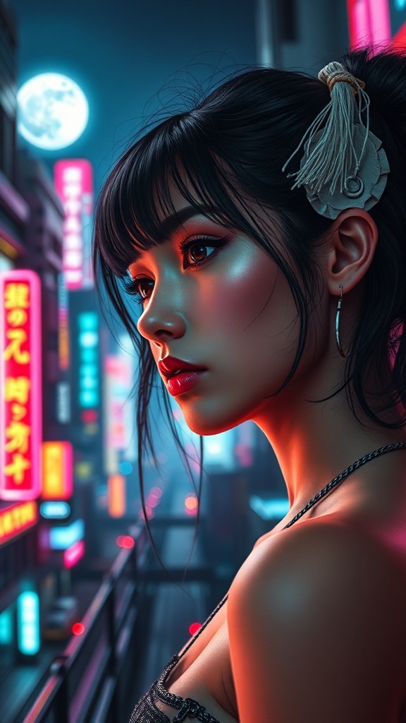 View this AI-generated image featuring intricate complex detail dynamic depth of field young woman futuristic urban cityscape cyberpunk aesthetic vibrant neon glow illuminated neon lights nighttime atmosphere glowing moon overhead three quarter perspective emphasis on form delicate string accessory.