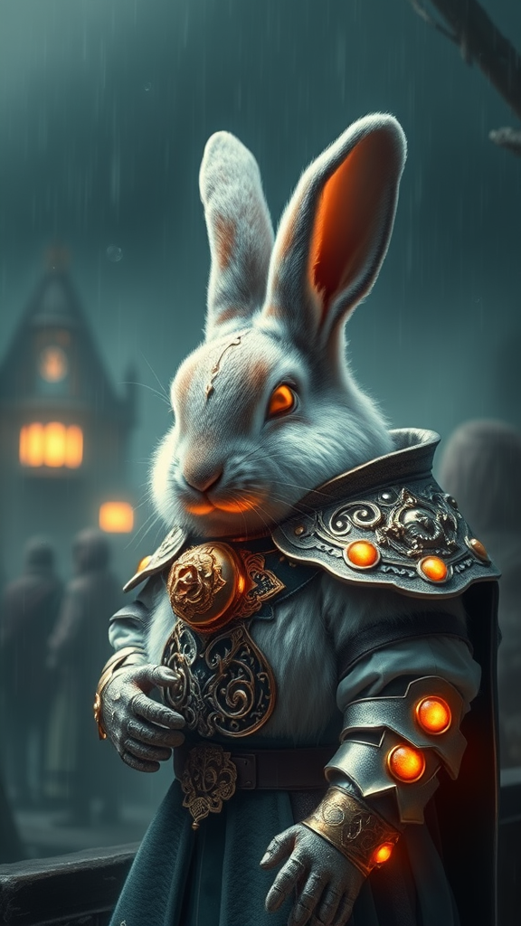 Intricate design featuring a majestic bunny adorned in high ornamented light armor, its fluffy fur shimmering through a foggy, wet, and stormy atmosphere. The scene is captured with a cinematic 70mm lens, showcasing highly detailed elements enhanced by glow effects. The atmosphere is both ethereal and dramatic, with the setting rendered in stunning 16k UHD resolution, embracing HDR10 and Absurdres quality for an immersive experience. The enchanting environment draws the viewer into a world of fantasy and elegance.