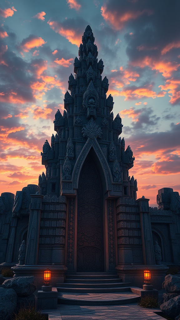 Intricate design, meticulously carved from ancient mystical stone, showcasing exquisite detailing; features cinematic lighting with ethereal volumetric rays and a soft bloom effect. Dramatic illumination highlights the scene against the backdrop of richly colored clouds at sunset, creating a stunning photorealistic digital artwork. This piece, trending on Artstation, is presented in 8k HD, delivering high-definition realism with subtle creative enhancements.