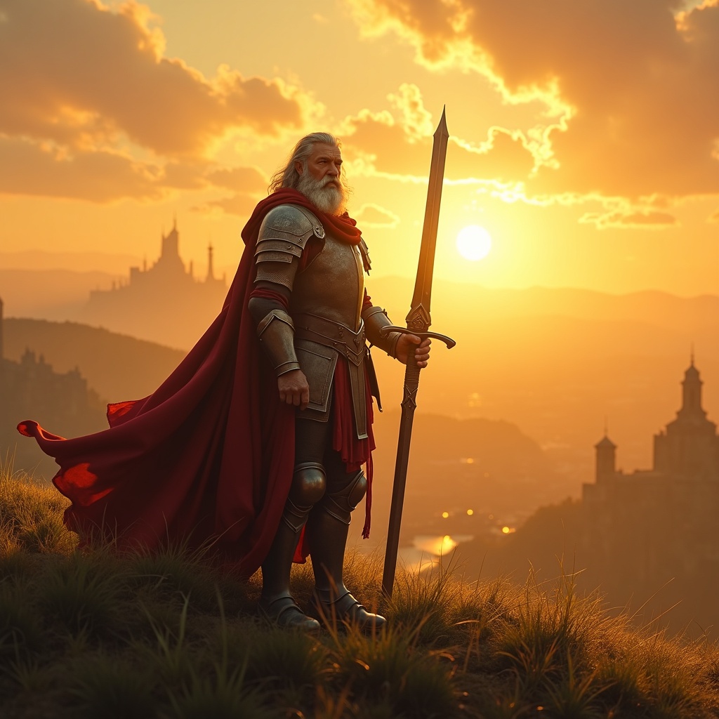 intricate details, cinematic lighting, 1 heroic man, highly detailed, medieval ambiance, fantasy setting, rpg character, dnd inspiration, ultra resolution, ultra quality, aged warrior in regal armor, long flowing cape behind him, standing on a grassy hill overlooking a vast kingdom, the golden glow of the setting sun casting a dramatic silhouette, stern and determined expression, sword held aloft, ancient ruins visible in the distant background, atmosphere filled with magical energy, the scene conveying a sense of adventure and valor.