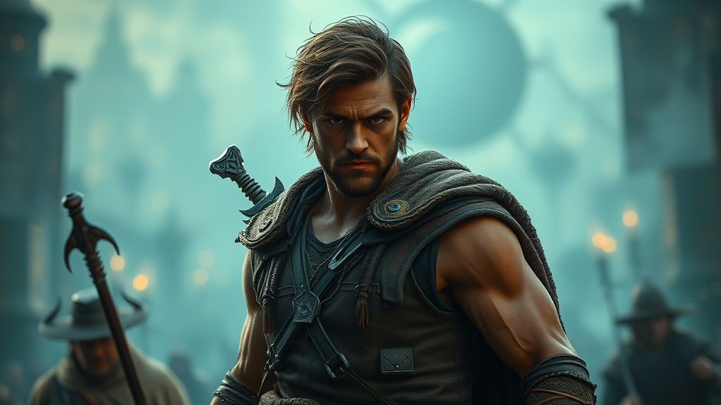 Intricate details, cinematic lighting, a lone man in a heroic pose, set against a medieval ambiance, reminiscent of a fantasy RPG or DND scene, rendered in ultra resolution and ultra quality, showcasing a rugged male character with determined eyes, powerful stance, and commanding presence, subtle touches of mysticism with hints of ancient lore, the atmosphere rich with the aura of adventure and untold stories, capturing the essence of an epic journey through an enchanting, immersive world.