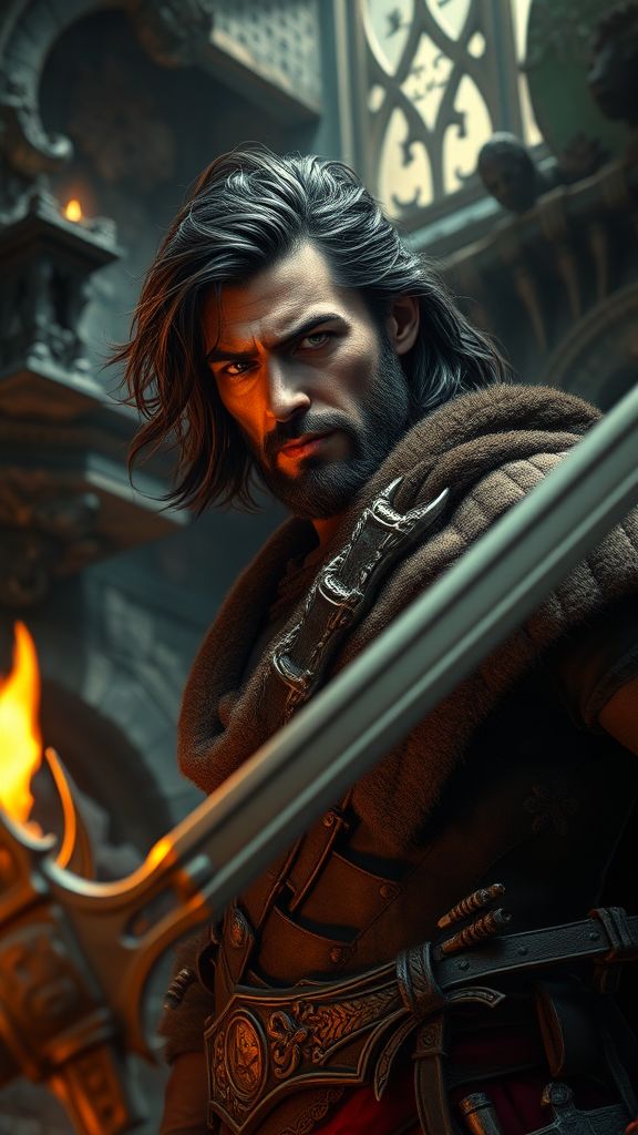 Intricate details, cinematic lighting, one heroic man in a highly detailed pose, surrounded by a medieval ambiance with a fantasy RPG vibe, inspired by DnD, captured in ultra resolution and ultra quality. The scene conveys a sense of adventure and courage, with hints of mystical elements in the environment. Avoidance of duplicated or malformed features ensures a flawless depiction. The protagonist exudes a strong and commanding presence, deeply immersed in this richly textured world.