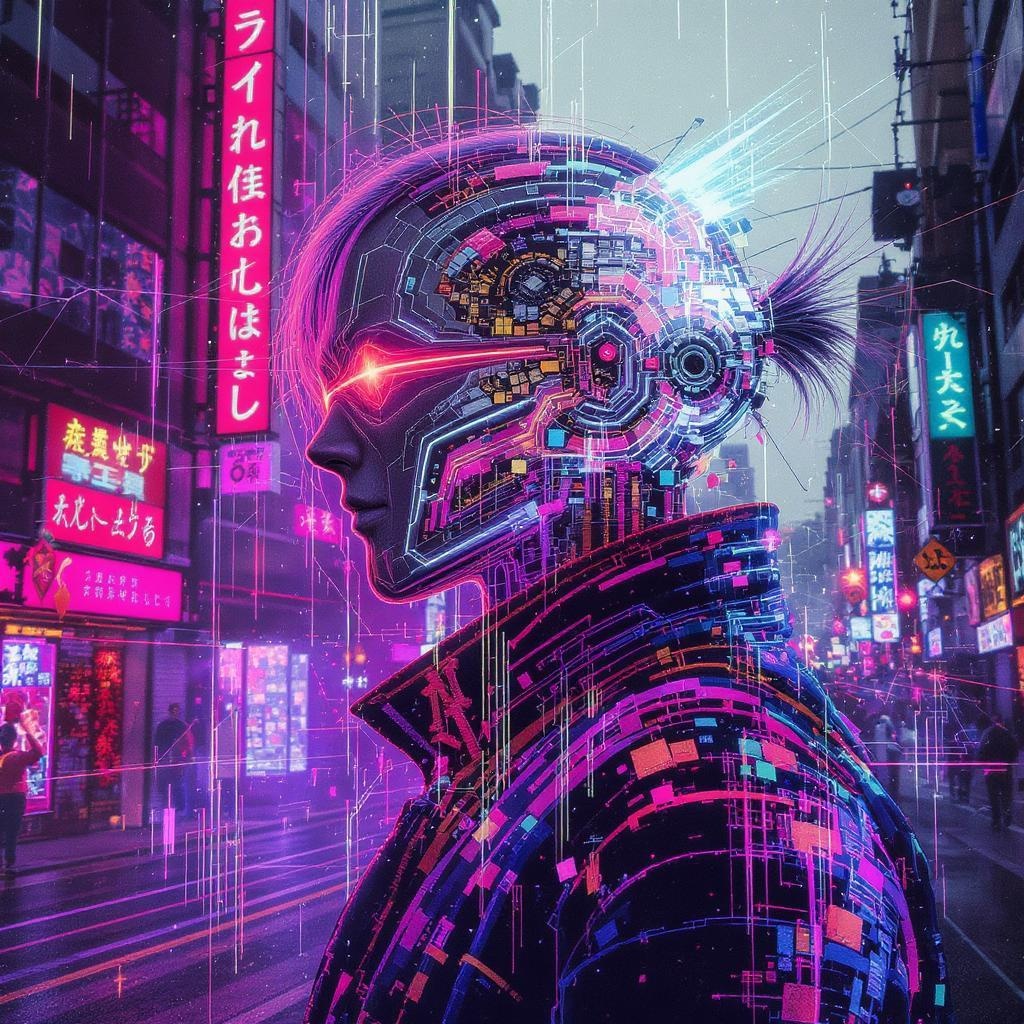 Intricate double exposure digital art inspired by Yuumei, set against the backdrop of a bustling urban street with a distinct cyberpunk vibe, capturing the essence of trends on CGSociety. Utilizing multiple exposure techniques, the piece features layers of textures enhanced by glowing holographic elements. A vivid technicolour palette is brought to life by the bright city lights, reminiscent of "The Matrix" film's color scheme found on Pinterest. This high-definition rendering creates a colourful, dream-like atmosphere with elaborate details, offering a futuristic and vibrant visual journey that captivates with its intricate narrative.