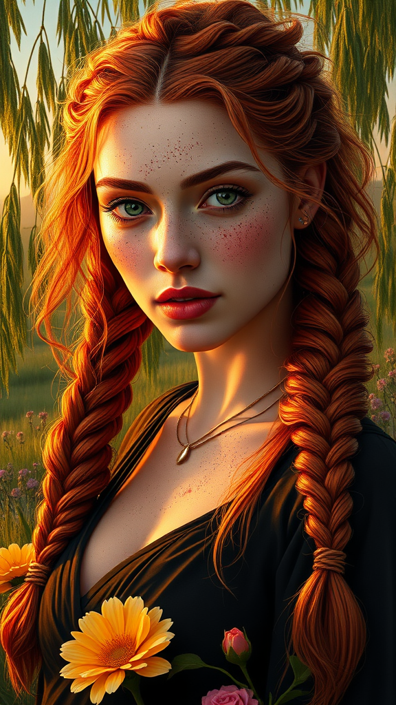 Intricate face, fiery ginger hair, sprinkled with freckles, defined features, strong square jawline, elaborate long braids, high cheekbones, sharp and striking features, heart-shaped lips, clad in an elegant, flowing dark dress, vivid green eyes, hourglass silhouette, ample bust, illuminated by dynamic golden hour light, captured in a stunning and colorful landscape, surrounded by weeping willows, lush green grass, and vibrant flowers, resembling a piece of elaborate earth art. Maintains a beautiful and colorful fantasy aesthetic, set against a matte background. The piece is a detailed and elegant oil painting, inspired by Artstation’s renowned concept artists such as Artgerm, Greg Rutkowski, Alphonse Mucha, and William-Adolphe Bouguereau, achieving hyper-realistic and high-quality results akin to an octane render. It is a highly detailed, zoomed-out composition that showcases the full body of a character akin to a lord of the rings bandit, characterized by mesmerizing freckles and long, artfully chaotic hair. The depiction is in UHD, HDR, and 8K, ensuring sharp focus and rich detail while avoiding undesirable elements such as duplicates, mutations, or low-quality artifacts.