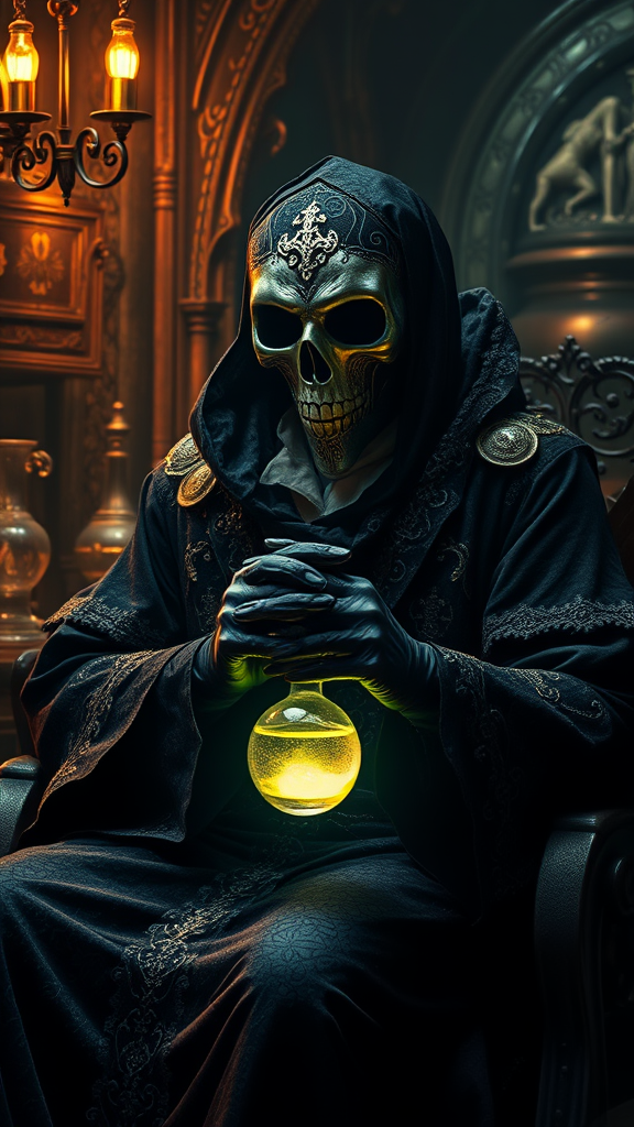 Intricate fantasy art depicting a plague doctor seated in an ancient laboratory, a glowing poison vial held delicately in gloved hands. The doctor wears a highly detailed, ornate mask accompanied by a luxurious, finely adorned black robe with elaborate patterns. The scene is rendered with high definition, showcasing intricate textures enhanced by volumetric lighting that casts ethereal glows and deep shadows. The ambiance is enriched with shimmering surfaces, ray tracing reflections, and glistening highlights, creating an almost otherworldly atmosphere. Lumen and screen space reflections add depth, while diffraction grading and supernova flares introduce a sense of cosmic wonder, all presented in an 8k resolution, striking a perfect balance of mystique and elegance.
