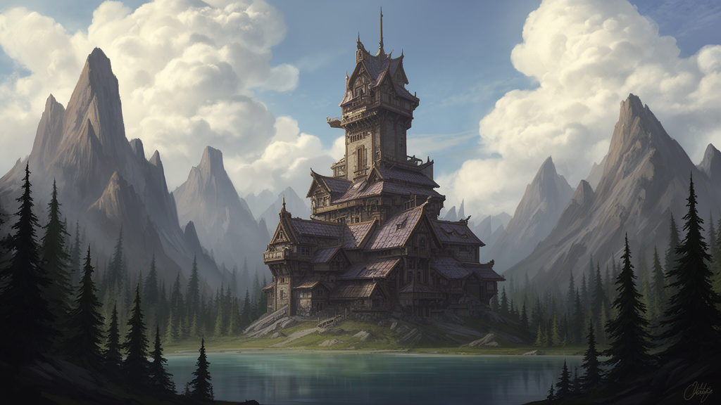 Stylized digital illustration of a fantasy wizard tower. The tower is tall, yet wide with low angled roofs and numerous outbuildings that seem to create a maze-like tower. The tower sits on the edge of a mountain lake, surrounded by pine trees. Tall jagged mountains sit the the background with large clouds above.