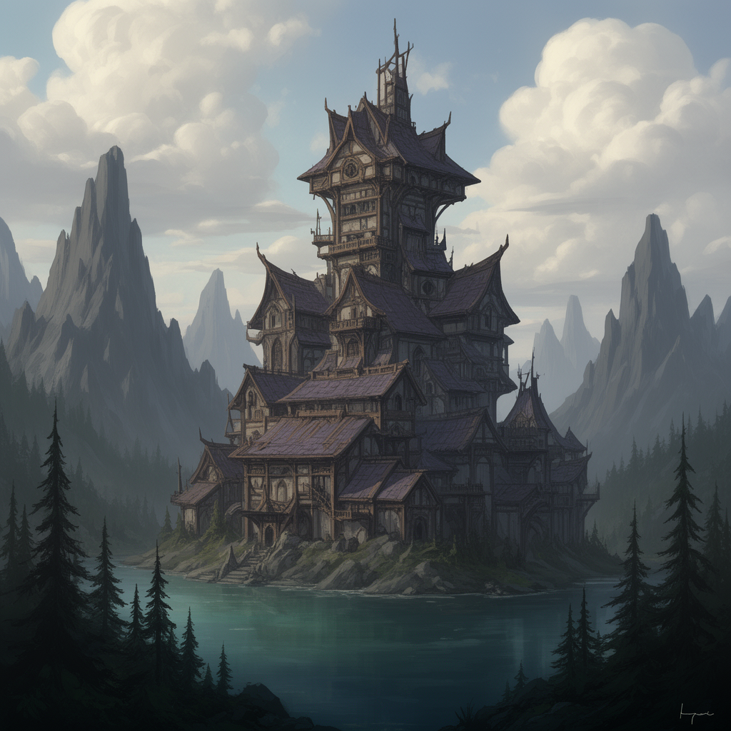 Stylized digital illustration of a fantasy wizard tower. The tower is tall, yet wide with low angled roofs and numerous outbuildings that seem to create a maze-like tower. The tower sits on the edge of a mountain lake, surrounded by pine trees. Tall jagged mountains sit the the background with large clouds above.