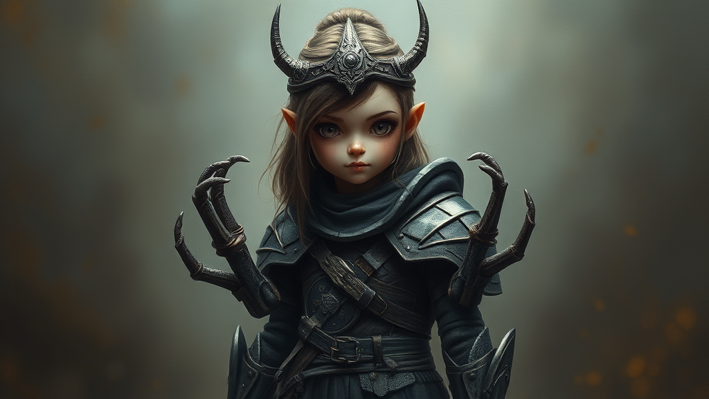 Intricate full body concept art illustration, dark muted focus, gothic style oil painting on canvas of a young viking warrior girl adorned in detailed armor, biomutant, dystopian theme, micro detail, high resolution, abstract elements, cartoon-like features, toy-like figure, framed design, 3d effect, unique proportion, subtle hues, surrealistic colors, atmospheric blur, artistic haze, dynamic pose, elongated figure, storyboard draft, unconventional hands with twisted fingers, intriguing image, fantastical anatomy, ethereal appearance, captivating mutation, floating elements, distinct proportions, evocative design, expressive face, imaginative form, dreamlike limbs, mesmerizing composition, artistic watermark.