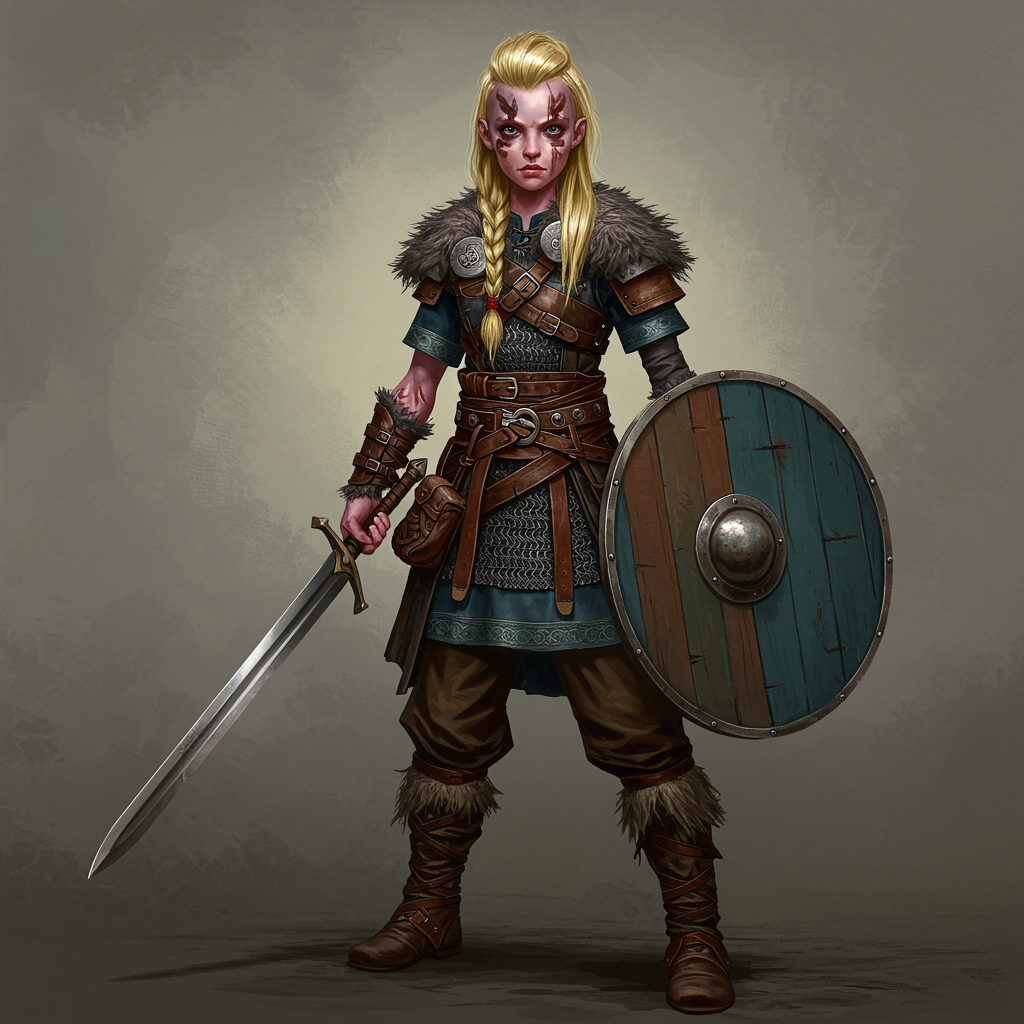 Intricate full-body concept art illustration of a young Viking warrior girl, set in a dystopian world, with detailed and elaborate attire reflecting her biomutant nature. The artwork, reminiscent of a plague-era oil painting on canvas, showcases a blend of micro details with a dark, atmospheric focus. Rendered in high quality, the scene captures the essence of a brave and determined character with a unique twist, emphasizing her heroic yet subtly mutated form. The colors are balanced and harmonious, with a hint of abstraction to add an artistic flair. Her expression and stance exude confidence, and the overall composition maintains clarity and cohesion, avoiding any exaggerated or unnatural anatomical distortions. The piece stands framed as a testament to creative storytelling through visual art.