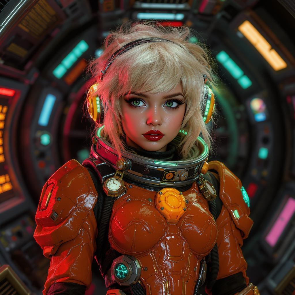 Intricate hyperdetailed steampunk spaceship interior with a cinematic shot focusing on the upper body, perfectly centered and shot with a 100mm lens. Depict an award-winning, dynamic pose featuring a cute girl with striking features, her blonde fluffy hair meticulously detailed. She's dressed in an intricately designed orange and green steampunk fantasy space suit that catches every eye. Her face is hyperdetailed, featuring gloss lips, enhanced by cinematic lighting and enveloped in volumetric lighting. The scene benefits from studio lighting, creating captivating neon reflections and global illumination. Soft shadows and bold contrast enhance vivid colors throughout, while subtle creative additions highlight her character within this vivid steampunk fantasy setting.