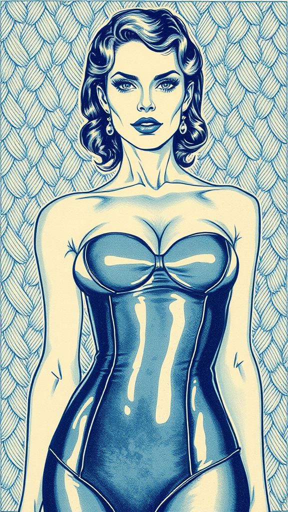 Intricate intaglio etching of an imposing woman, exquisitely beautiful and slender, exuding allure. Her eyes are assertive, her stance confident, wearing a skin-tight latex bustier that is both revealing and elegant. Rendered in meticulous detail with fine line etchings in hues of light blue and light green, she stands against a backdrop of plaited line patterns. The atmosphere is sensuous and stimulating. The perspective is a three-quarter shot from below, achieved through colour lithography and engraving with light ink on cotton paper, featuring ultra-fine lines. This piece portrays a modern power figure, a nod to traditional printing techniques used in currency to symbolize the commodification of female empowerment.