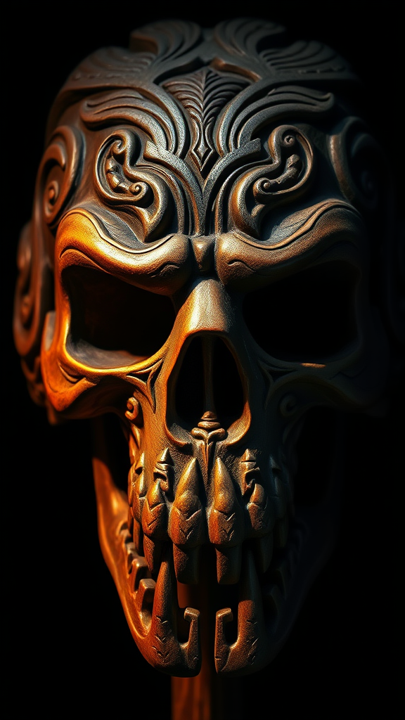 Intricate Maori skull sculpture captured in dramatic high-definition, highlighting masterful carvings illuminated in striking cinematic shadows.