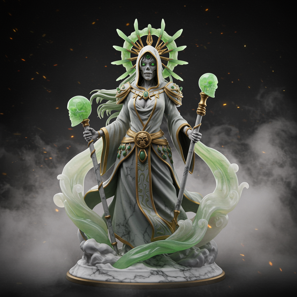 Intricate marble and jade sculpture of a female necromancer, enveloped in ethereal volumetric fog, hyperrealistic, with mesmerizing and ultra-detailed features. Set against a dynamic cyber backdrop, utilizing cinematic lighting to highlight every stunning detail. Presented in a wide-angle CGI view, showcasing the breathtaking artistry in a high-definition 3D render. The composition blends elements of realistic photography with stylized digital art, capturing both the mystique of an anime illustration and the depth of a digital painting, ensuring an awe-inspiring visual experience.