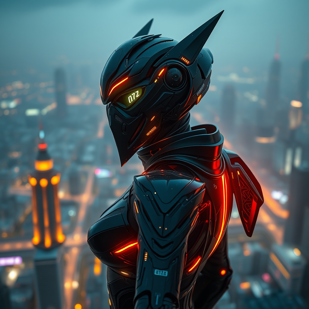 Intricate mask, female figure in sleek exo suit, caught in dynamic motion, viewed from the hip, sci-fi aesthetics, paired with a futuristic hawk design, inspired by warframe. The dark ambiance highlights intricate details with a rogue and slender demeanor, adorned in battle armor against a backdrop of a sprawling futuristic city. Rendered in stunning 8k quality, featuring a teflon-like segmented armor, enhanced by octane rendering. The ensemble glows with energy lights and vibrant neon accents. The image maximizes detail and fine detail with a combination of matt and smooth surface textures. Realism is accentuated through complex volumetric lighting, crafted meticulously in 3D for an ultra-high-definition experience.