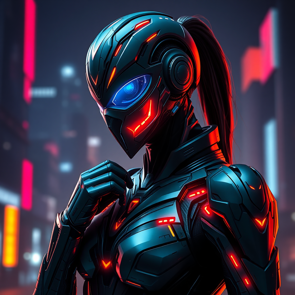 Intricate mask, sleek female figure in advanced exosuit, dynamic pose, hip angle, sci-fi aesthetic, falcon theme, high-tech warfare attire, dimly lit environment, highly detailed craftsmanship, stealthy, youthful silhouette, combat armor, futuristic metropolis backdrop, stunning 8k clarity, polymer surface, articulated armor design, high-gloss rendering, energy glows, vibrant neon accents, ultra-detail, finely tuned realism, complex volumetric lighting, 3D, ultra-high-definition, smooth matte finish, organic curvature, max resolution, seamlessly integrated technology.