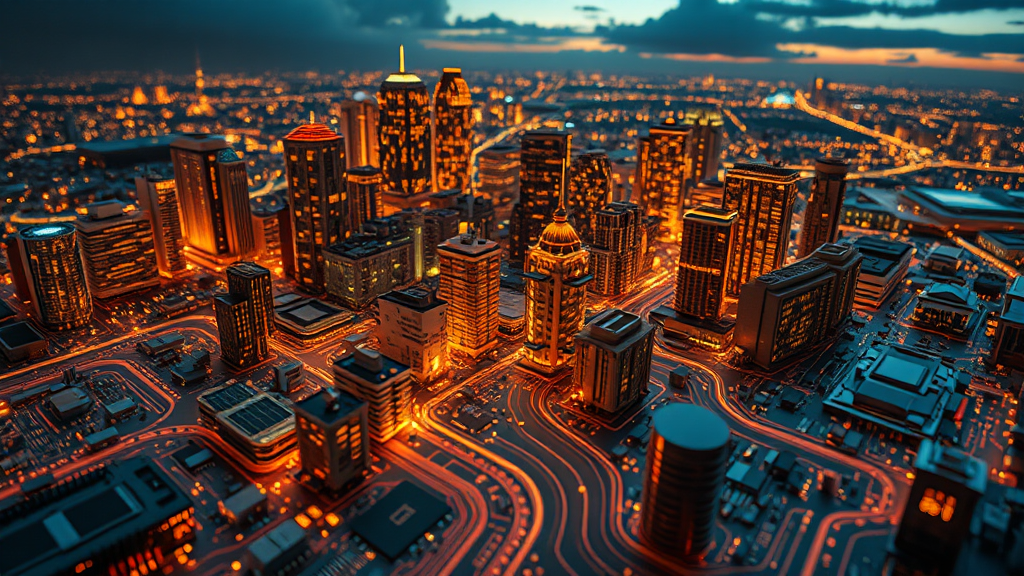 Intricate microscopic society thriving on a hyper-realistic circuit board, electrifying details of their miniature existence captured in stunning 8k resolution, each component transformed into a bustling metropolis where residents navigate shimmering pathways of silicon and copper, vibrant energy pulses like city lights under a twilight sky, microscopic architecture blending seamlessly with the engineered landscape, revealing a world where the digital and organic collide in breathtaking harmony.