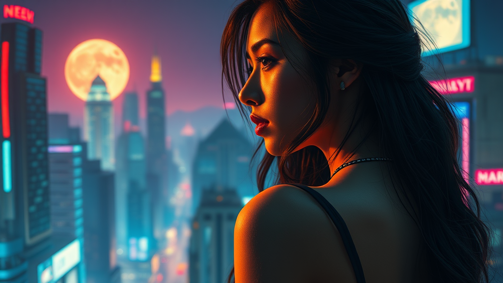 Intricate narrative, vibrant intricacy, focus on perspective, woman in profile, futuristic urban landscape, cyberpunk aesthetic, glowing neon hues, illuminated cityscape, midnight ambiance, luminous moon, partially turned stance, feminine allure, delicate thread.