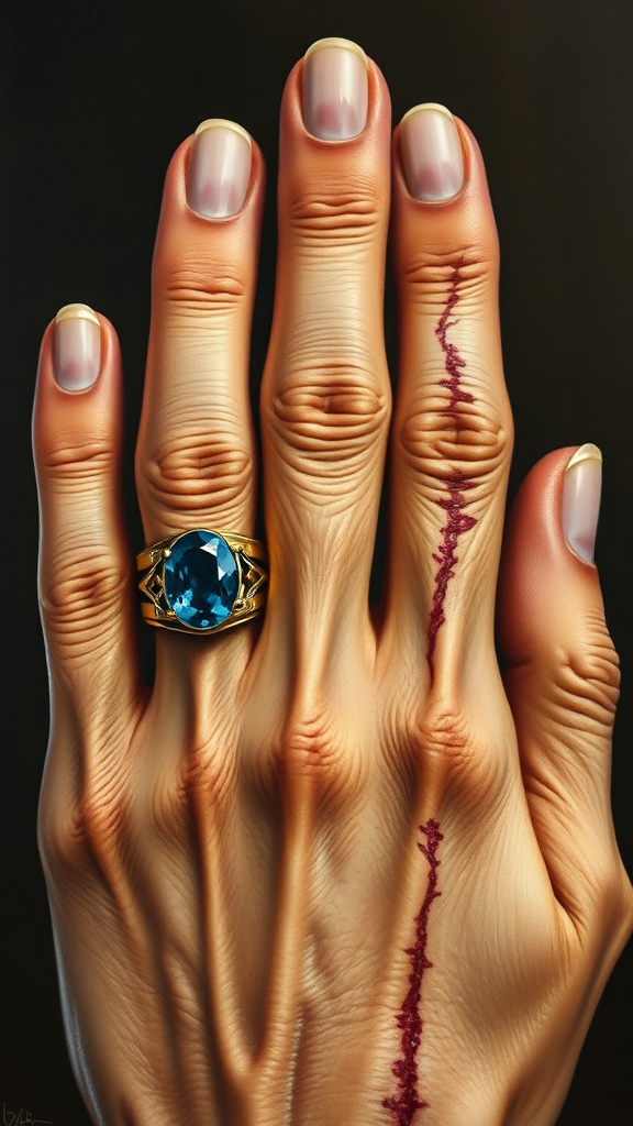 Intricate oil painting depicting an aged hand adorned with a golden ring featuring a radiant blue sapphire and another finger with a silver ring showcasing a striking amber gemstone. The fingers gracefully gesture upwards, with the hand marked by a deep and ancient scar, evoking a sense of wisdom and history. The hand is elegant and anatomically correct, with five fingers, each illustrating the passage of time and life’s stories.