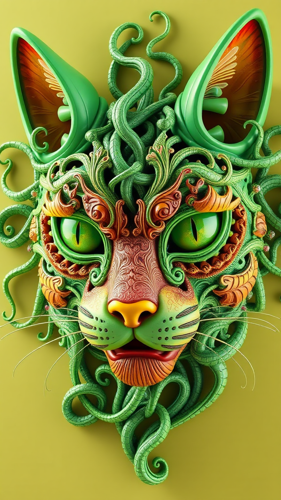 Intricate ornate cat face mask, bursting with vivid colors, crafted as a mesmerizing 3D sculpture; lush green hues entwine with twisting vine-like forms, featuring an array of tiny, delicate flowing lines. The design melds abstract and psychedelic elements, capturing an 8k level of detail that exemplifies artstation-quality craftsmanship.
