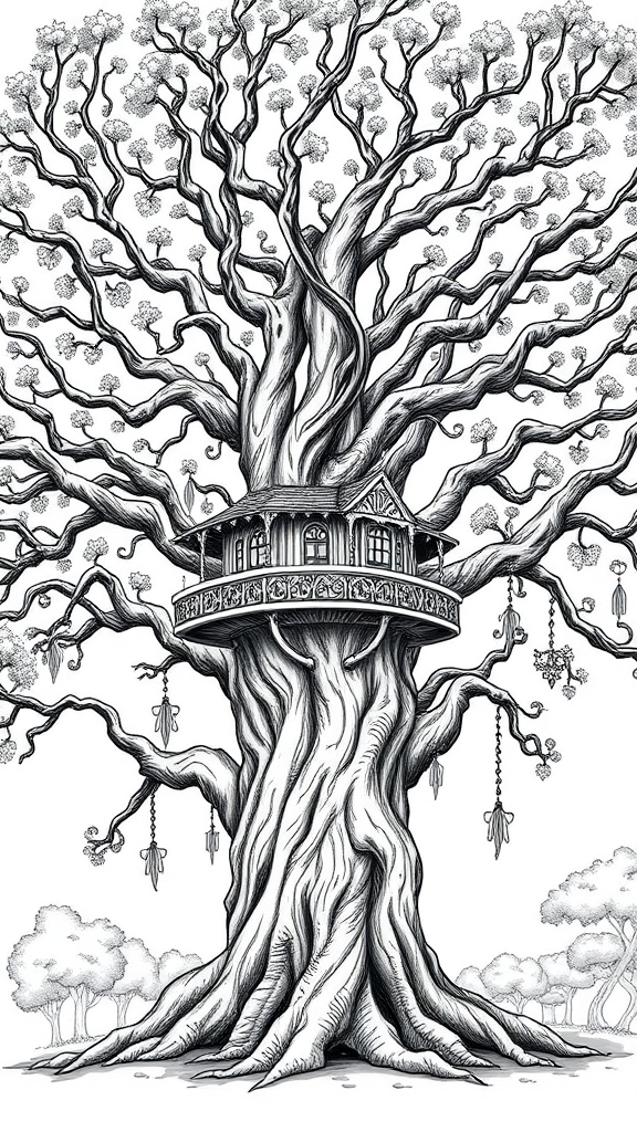 Intricate ornate tree-house nestled within a stunning, enormous turquoise Angel Oak, with emphasis on elaborate details and creativity. A monochrome sketch style enhances the charm, featuring a simple or absent background.
