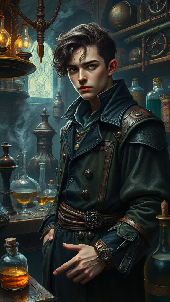 Intricate painting of a young male alchemist in a medieval lab, surrounded by potions and detailed equipment, set in a dark fantasy atmosphere. He wears a richly designed robe with leather accents. The setting is filled with elements that evoke a sense of mystery and magic. Despite being incredibly detailed and hyper-realistic, the artwork conveys a slightly surreal and otherworldly vibe, as if from a forgotten realm. The focus is on the elaborate details of the alchemist's attire and the mystical environment, ensuring a captivating and immersive visual experience. The overall composition highlights the enigmatic and magical essence of alchemy in a historical context.