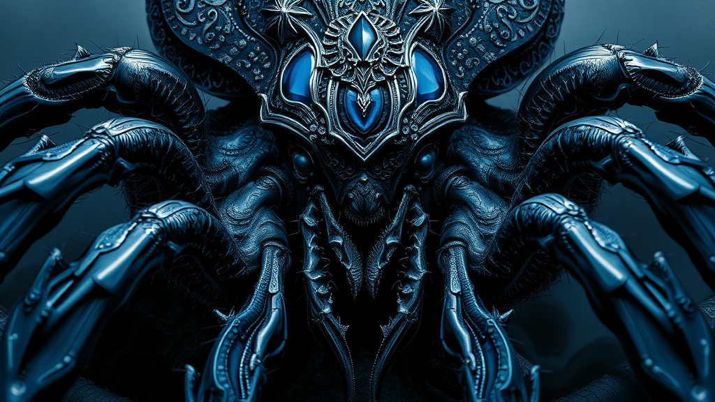 Intricate portrait of a regal spider queen, her eledrae essence captured by a masterful artist reminiscent of Boris Vallejo, enveloped in dark sapphire and silver hues. Her transformation feels like polished metamorphosis, brought to life with trompe-l'œil illusionistic detail. This contemporary spider-goddess is rendered with bold, large-scale brushstrokes, echoing stripcore aesthetics, blending mystique with elegance.