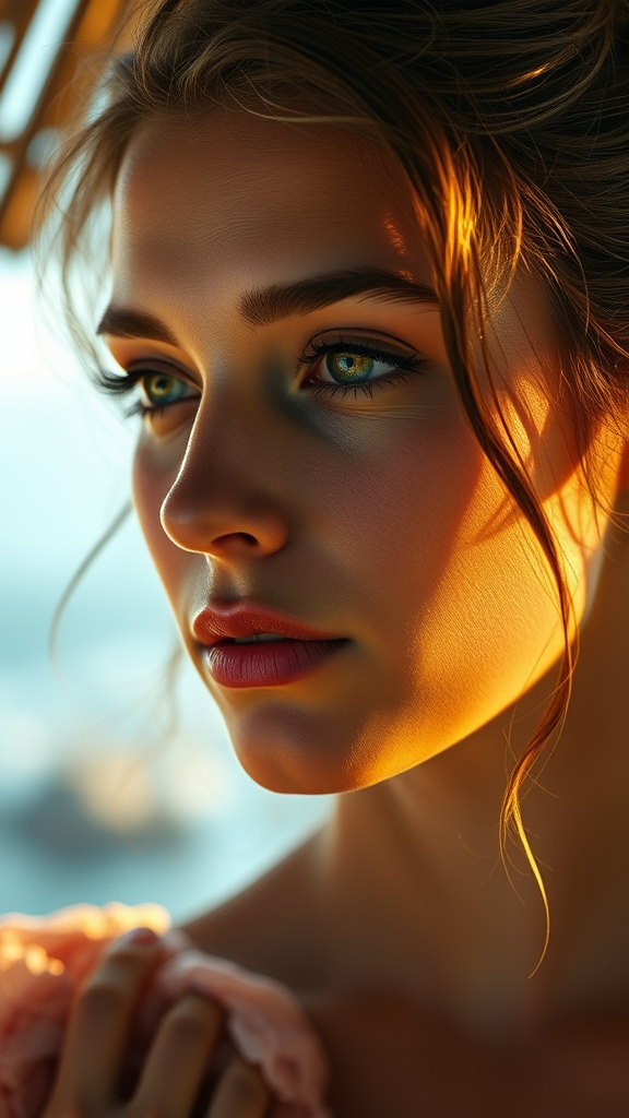 Intricate portrait of a young woman inspired by Joaquin Sorolla, basking in gentle natural light, captured with an 85mm lens, warm sunlight casting a glow on her features, cinematic illumination with delicate lumen reflections, set in a breathtaking environment, hyperrealistic detail, enhanced with CGI techniques, rendered with octane precision and advanced raytracing.