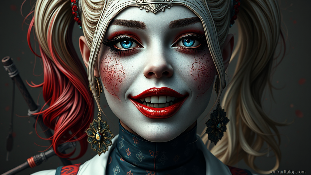 Intricate portrait of Ana de Armas reimagined as Harley Quinn, featuring abstract elements and intricate artwork. The style reflects the influences of Tooth Wu, WLOP, Beeple, and Dan Mumford, with the precision of octane render. This piece is trending on ArtStation, capturing the essence of Greg Rutkowski's coherent and symmetrical compositions. It boasts cinematic hyper-realism and exceptional detail, rendered in 8k, with creative modifications that maintain the essence of the original concept.