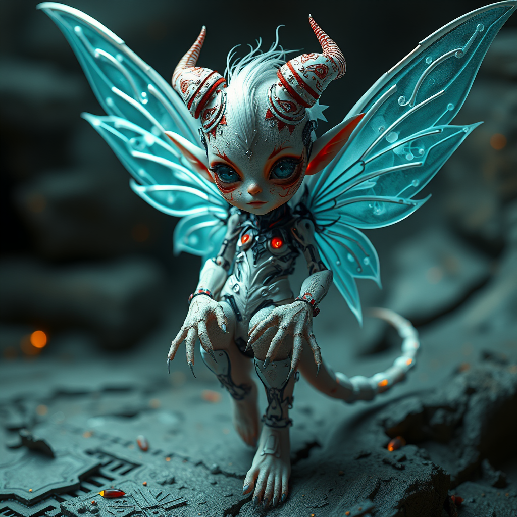 Intricate poster of a surreal cybernetic elven pixie creature, blending cyberpunk and mystical elements, with a hypnotic aura. Barefoot, full body view showcasing an irresistibly cute appearance juxtaposed with a malevolent soul. The design embodies the duality of good and evil, with elements of demon-angel and white witchcraft. Hyper-realistic and meticulously detailed, it boasts a breathtaking composition, with heightened emotional depth. The lighting is dramatic and cinematic, enhancing its photorealistic quality. The piece is designed for 8k resolution, ensuring every detail captivates the viewer.