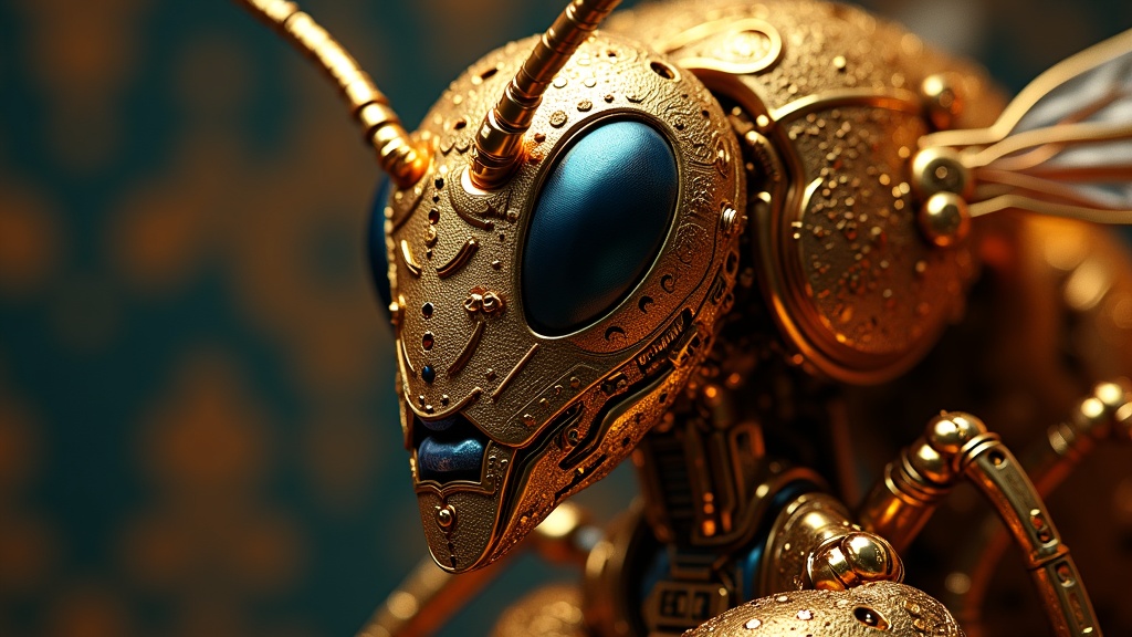 Intricate 3D render of an exquisitely detailed metallic bee android visage, showcasing cyborg and robotic elements. The face is adorned with ornamental lace patterns interwoven with vibrant cables and microchips, revealing hyperrealistic anatomical structures and facial muscles. Set against a luxurious cyberpunk backdrop, the scene is illuminated with elegant studio soft lighting and a striking rim light that accentuates the vibrant chrome and brass hues. The 150 mm composition boasts an H. R. Giger-inspired aesthetic, with a refined blend of organic and mechanical textures, captured in stunning 8k resolution using Octane render. The background features a beautifully intricate pattern, enhancing the overall elegance and depth of the futuristic creation.