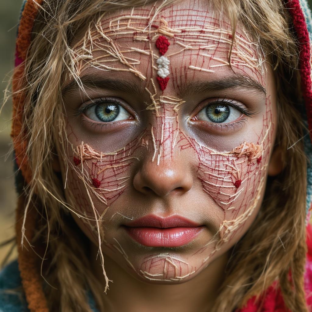 Intricate rough thread embroidery covering a young girl's face, capturing the essence of raw, unrefined craftsmanship with visible imperfections, displaying a natural and untouched appearance, showcasing authentic textile artistry in a 3:2 aspect ratio with a highly stylized and imaginative touch.