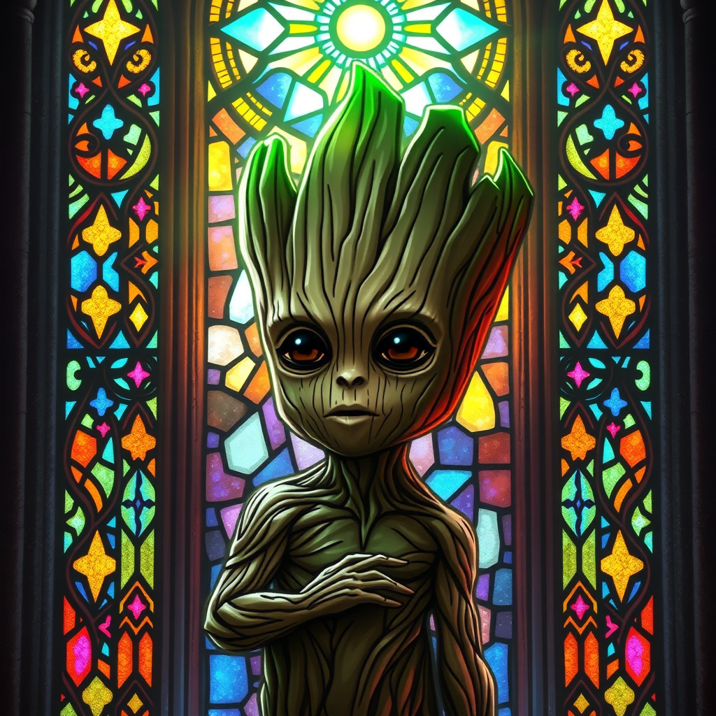 Intricate stained glass window depicting baby Groot, featuring vibrant colors and a glowing aura. The design is reminiscent of Gothic cathedral style, with a radiant backlit effect. The piece is highly detailed, merging elements of religious art with a fantastical twist, echoing the artistic styles of Clive Barker, H.R. Giger, and Brom. This trending concept art on Artstation showcases a digital painting that balances whimsical charm with a sense of mysterious reverence.