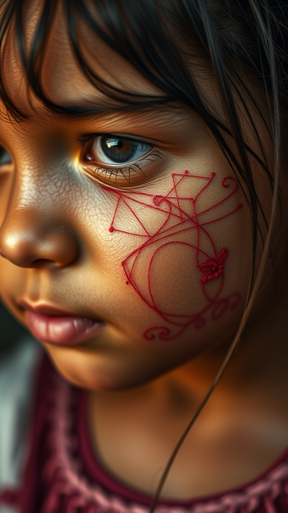 Intricate thread embroidery on a young girl's face, capturing a raw and unrefined aesthetic, embracing the natural imperfections and texture without digital alterations, in a 3:2 aspect ratio with a touch of artistic flair.