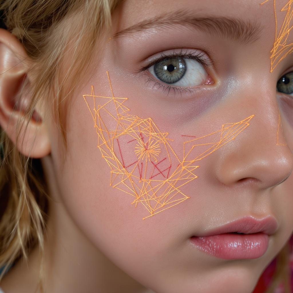 Intricate thread embroidery on a young girl's face, capturing the raw and unpolished texture, with imperfections and authentic details untouched by digital alterations, presented in a 3:2 aspect ratio with a hint of artistic flair.