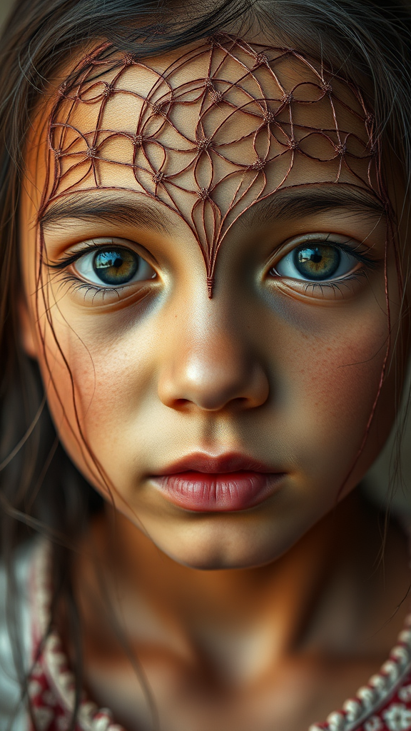 Intricate thread embroidery pattern across a young girl's face, capturing the essence of raw artistry and imperfect beauty; natural and unaltered, evoking an authentic, handcrafted feel, enhanced with subtle creative embellishments, maintaining a rich, stylized depth with an aspect ratio of 3:2.