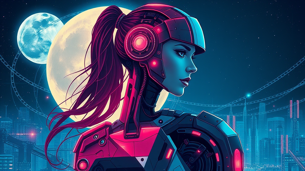 Intricate vector illustration of a female cyborg silhouette, blending the elegance of a moonlit knight with the sleek precision of a beautiful android; a captivating sci-fi movie poster featuring a woman in a futuristic space suit; cyberpunk-inspired art with vivid details and a touch of neon ambiance.