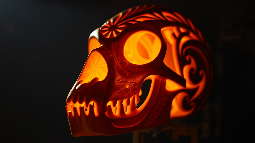 Intricately carved Maori skull illuminated in dramatic cinematic lighting capturing the delicate artistry and cultural depth.