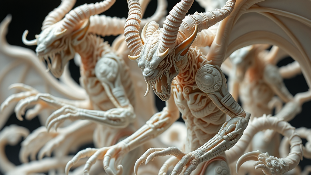 Intricately carved porcelain cyborg demons in diverse full body poses, high-definition cinematic landscapes inspired by Miki Asai Macro photography, ultra close-up, exceptionally detailed, trending on artstation, sharp focus, artistic studio lighting, featuring elaborate textures and rich details, crafted in the style of Greg Rutkowski.
