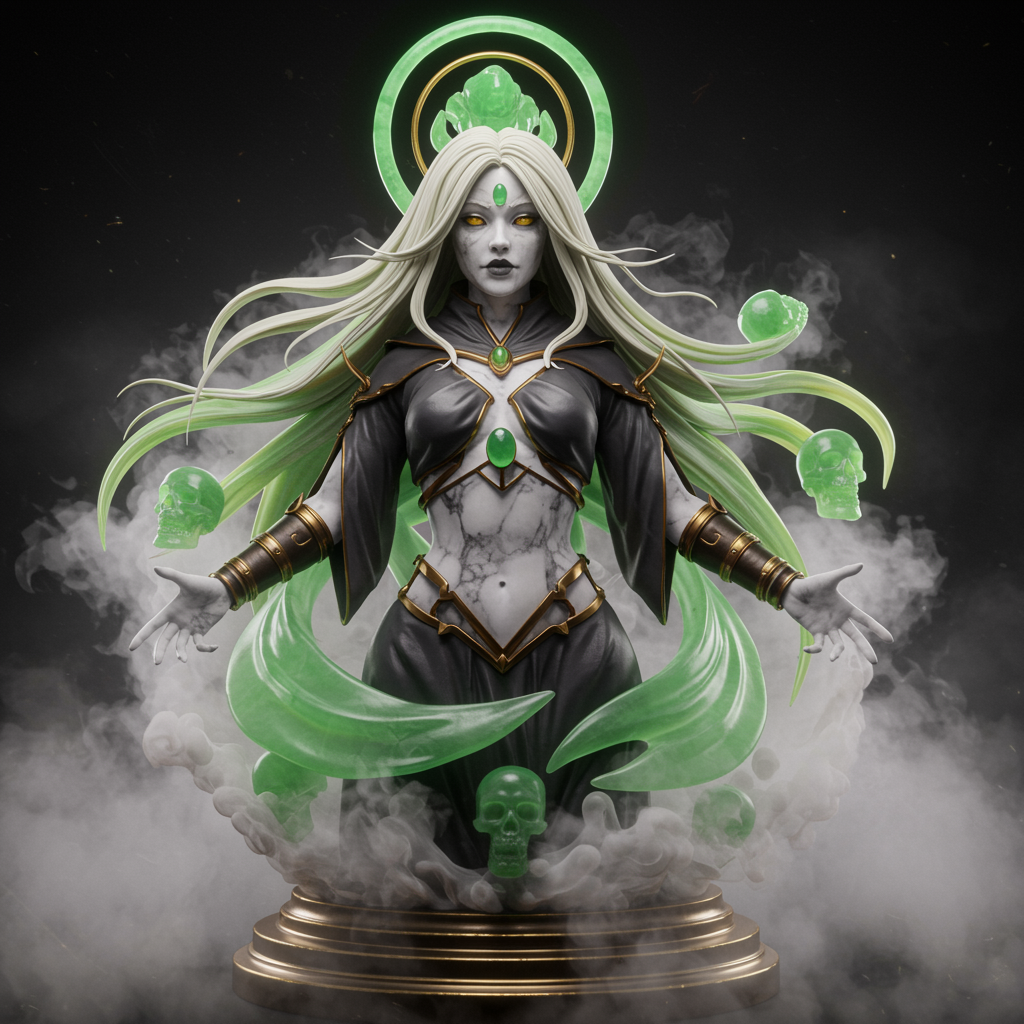 Intricately crafted marble and jade sculpture of a female necromancer surrounded by ethereal volumetric fog. Captivating hyperrealism with unreal engine precision, showcasing extraordinary detail against a futuristic cyber backdrop. Illuminated by cinematic lighting, the scene is a masterpiece of photographic prowess. Enclosed in a stunning environment, the wide-angle CGI view accentuates the 3D form, blending the styles of doll-like features with anime influences. The digital art combines illustration and painting techniques to achieve a masterpiece with enhanced dynamics. Attention to anatomical accuracy and harmonious proportions ensures a visually pleasing subject devoid of imperfections like low resolution or artifacts.