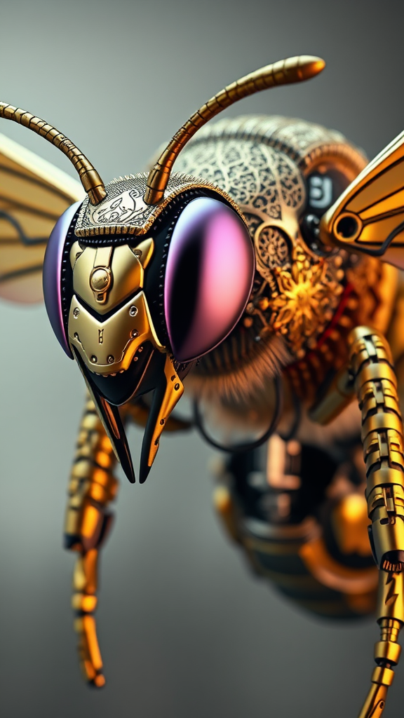 Intricately designed 3D render ultra-detailed of a stunning metallic bee with exquisite cyborg elements, featuring robotic components, full-body at 150 mm scale, set in soft, luxurious studio lighting. The bee displays a divine face with god-like facial features, accented by a delicate rim light. It boasts vibrant and opulent details, embodying a luxurious cyberpunk essence with intricate lace patterns. Its hyper-realistic appearance is enhanced by an array of electric cables and microchips, providing an elegant aesthetic. The bee is framed against a stunningly beautiful background, created with Octane render, echoing the distinctive H.R. Giger style, presented in breathtaking 8k resolution.