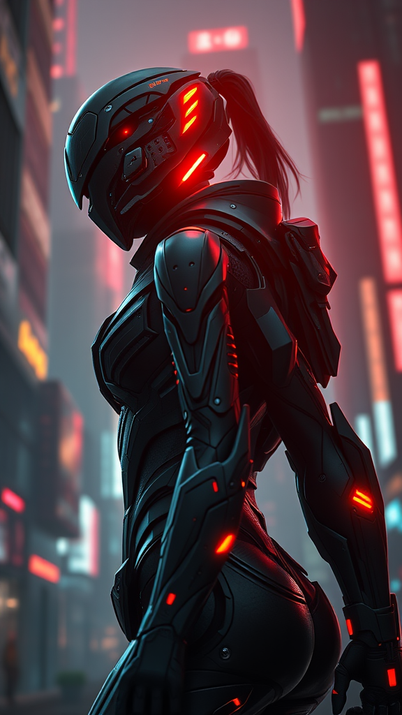 Intricately designed mask, female figure in an advanced exosuit, in dynamic motion, focusing on hip profile, sci-fi aesthetic, inspired by the grace of a hawk, warframe influence, enveloped in a shadowy atmosphere, adorned with elaborate details, rogue-like, slender and youthful silhouette, engaging battle armor, set against a vivid futuristic cityscape, rendered in outstanding 8k quality, featuring a teflon-coated segmented armor, octane rendering effects, vibrant energy lights, neon accents, maximum detail and precision, matte finish juxtaposed with smooth elements, hyper-realistic, featuring intricate volumetric lighting, 3D and UHD attributes, presented in an 8k resolution.
