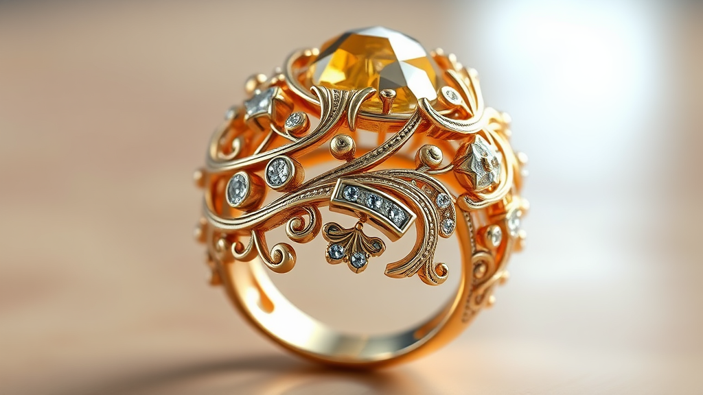 Intricately designed ring in gold and silver, featuring elaborate modeling and rendering, with exquisite detail and photorealistic elements, capturing a sense of realism and luxury with subtle creative embellishments.