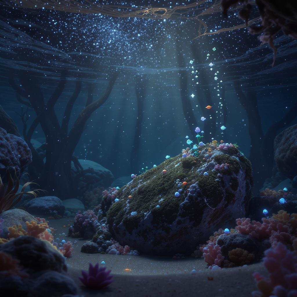 Intricately detailed 3D render in 8k featuring a mesmerizing sea under a starry night sky, with a moss-covered low poly rock. The scene is illuminated with warm, cozy indoor lighting, creating a cinematic atmosphere. The character design draws inspiration from the unique styles of Mark Ryden, Pixar, and Hayao Miyazaki. A close-up view captures the cinematic lighting and abundant fine details, evoking a dreamcore aesthetic. This piece is trending on ArtStation, rendered in hyper-realistic 4k quality with extreme attention to detail. Utilizing Unreal Engine 5, the scene benefits from ultra-realistic detail quality, enhanced by overcast reflection mapping and movie-quality VFX post-production. Dramatic shadows are cast with RTX ray tracing lighting, further refined by 8k post-processing in a hyperrealistic style reminiscent of Redshift and octane render, all captured in breathtaking 8k resolution.
