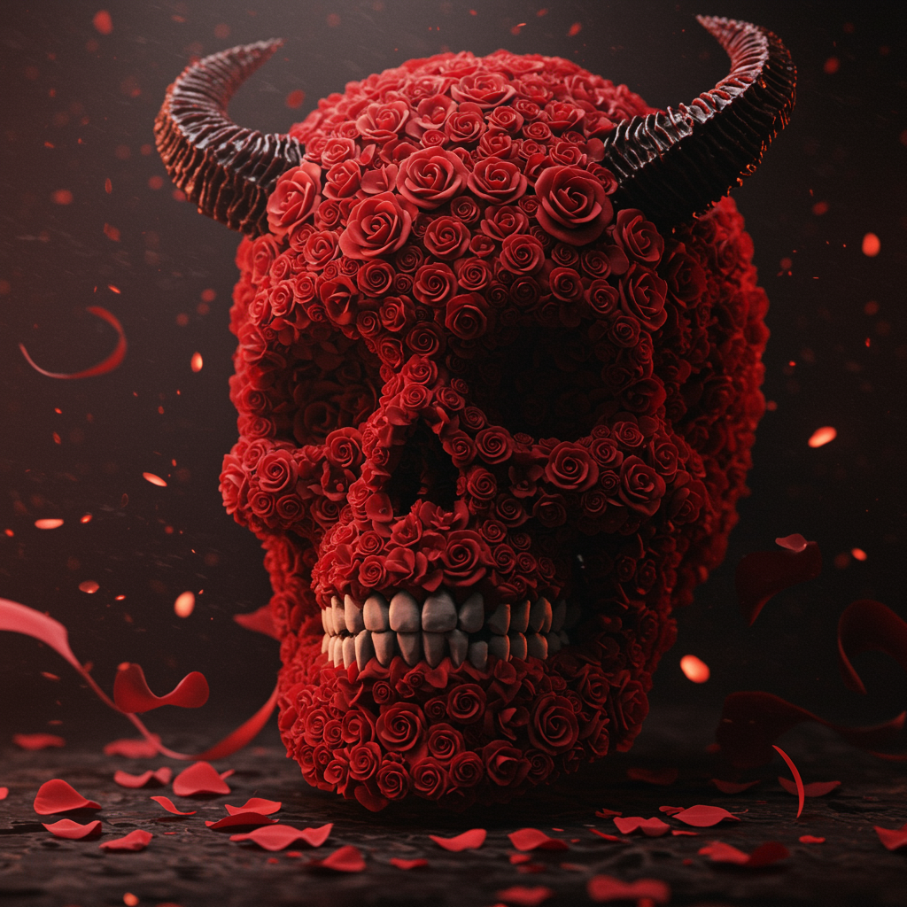 A hyperrealistic, intricately detailed artwork of a skull made of red roses, infused with elements of organic horror and devilish themes, evoking a sense of death and mystery. The composition centers around a masterful blend of baroque elegance and Art Nouveau style, drawing inspiration from artists like H.R. Giger, James Jean, Ed Blinkey, Greg Rutkowski, and Antonio Moro. Rendered in vivid, high-contrast colors with extremely sharp lines, the image exudes an epic and sensual cinematic atmosphere. Created using advanced digital techniques in 3ds Max, V-Ray, and Unreal Engine 5, with a touch of anime and manga influences, the piece radiates a faint, ethereal glow and features hand-drawn elements merged seamlessly with octane and cinema 4d rendering. The dramatic, photorealistic scene captures a dark and atmospheric essence, highlighting intense depth of field and sharp focus. This concept art, trending on ArtStation and CGSociety, embodies vivid colors and modelshoot style precision, with a professional touch reminiscent of Studio Ghibli and Jeremy Mann's works.