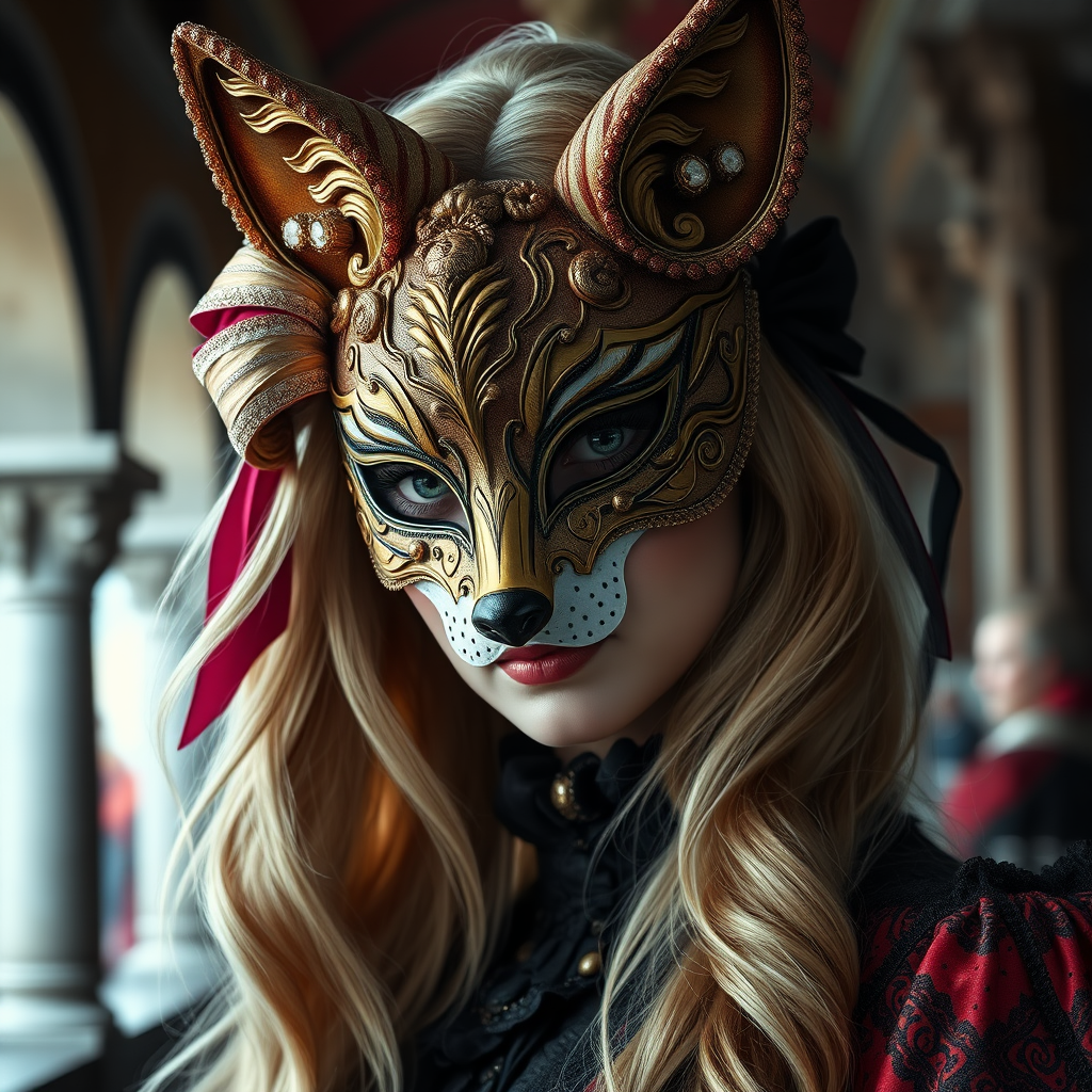 Intricately detailed, hyper realistic portrait of a woman in a Venetian carnival setting, adorned with a beautifully ornate, fox-inspired mask. Her long, golden blond hair cascades elegantly, complementing the rich textures and vivid colors of her attire. The scene is captured with oil painting techniques, emphasizing a 4k ultra-detailed rendering that brings the vibrant festivity to life. The subtle play of light and shadow adds depth, enhancing the opulence and mystique of the masquerade atmosphere.
